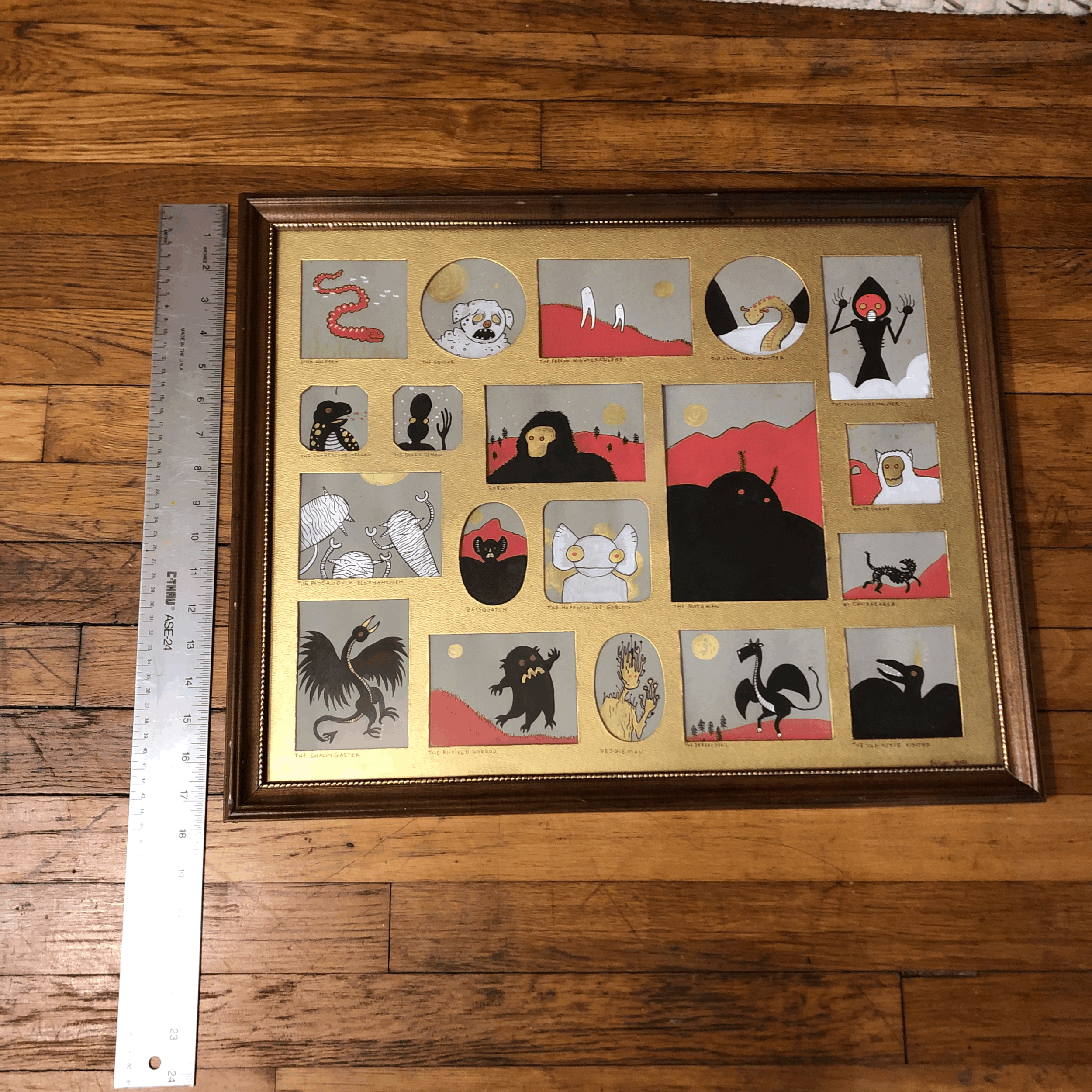 A collection of paintings of some of our favorite Cryptids in those mili-panel frames usually found at your grandmother’s house.